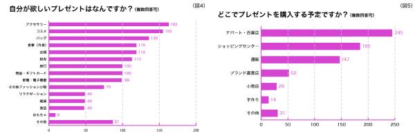 欲しいプレゼントは「アクセサリー」「コスメ」「バッグ」など、「食事(外食)」以外は身につけるものが上位に集中。複数回答率が高いことから、自分の興味のあるカテゴリーであればどれをもらっても嬉しい、という方も多いようです。(※図4)
