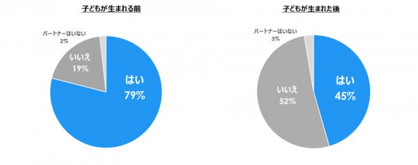 ・パートナーからクリスマスプレゼントをもらった割合は、子どもが「生まれる前」79%、子どもが「生まれた後」45%