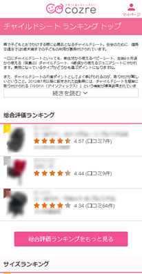 子育てに楽しさと新たな価値を提供する株式会社コズレ(本社:東京都千代田区、代表取締役:田中 穣二郎、以下コズレ)は、子育てナレッジシェアメディア「cozreマガジン」に「チャイルドシート 口コミランキング(β版)」を本日リリースしました。