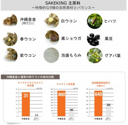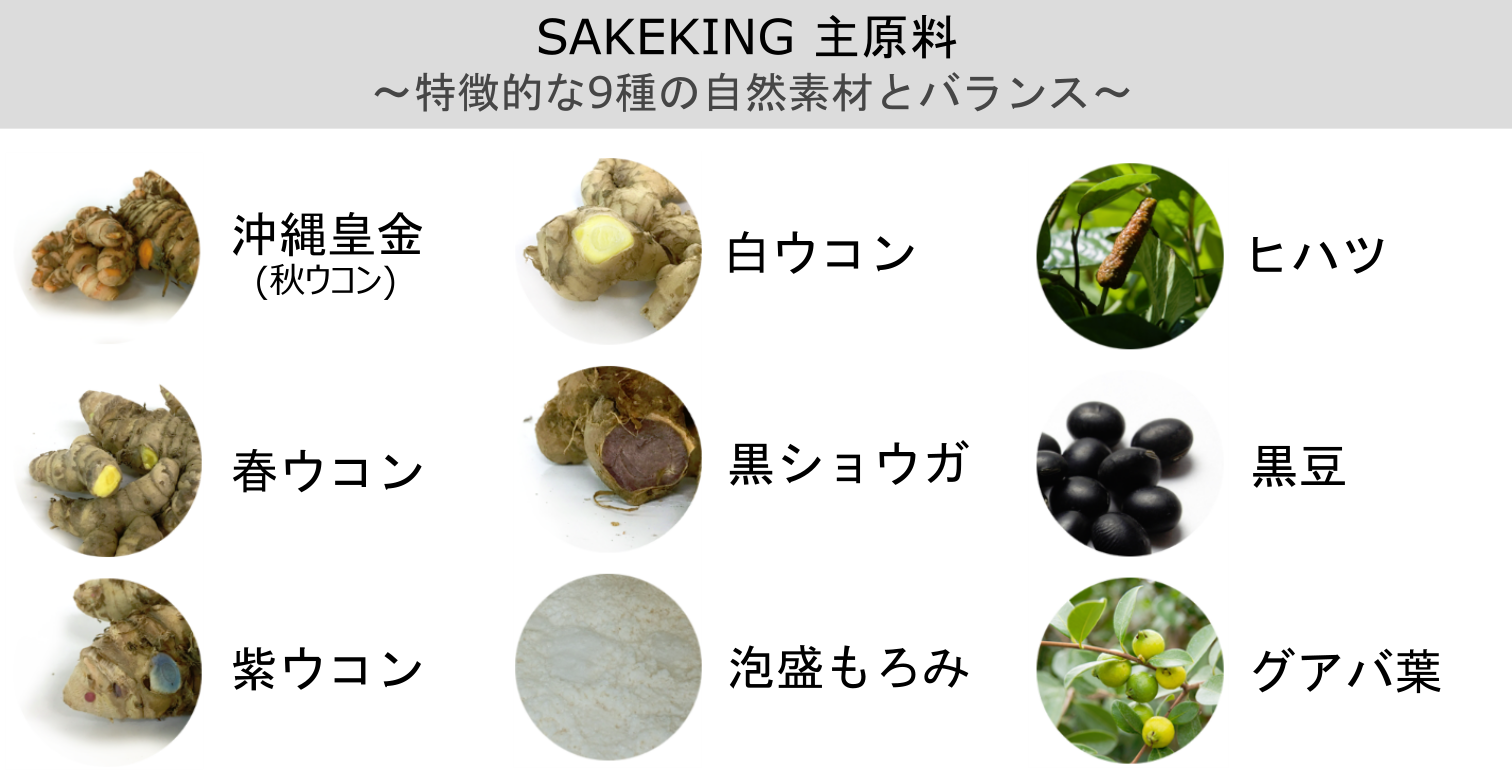 ナトハ黒人参茶をはじめ、自然素材、国産素材の特性を活かした商品を企画・開発してきたリフェットでは、「飲酒時や翌日の体調を気にして摂取するサプリメントやドリンクが、カラダに良い素材を使っていないのはナンセンス」との考えのもと、“琉球酒豪伝説”でお馴染みの(有)沖縄長生薬草本社との共同開発で、農薬不使用、化学肥料不使用の環境で栽培した 4 種の沖縄県産ウコンに加え、ヒハツ、黒ショウガ、泡盛もろみなど古くから伝わる健康素材を用い、飲酒時はもちろん、日々の美容・健康にも活用いただける商品として、「SAKEKING」を開発しました。