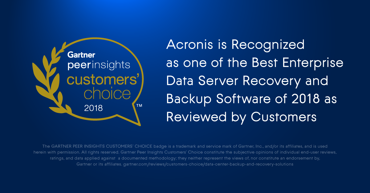 サイバープロテクションとハイブリッドクラウドソリューションのグローバルリーダーで、今年設立15周年を迎えるアクロニスは、本日、データセンター・バックアップおよびリカバリソフトウェアに関する2018年度のGartner Peer Insights Customers’ Choiceを再び受賞したことを発表します。