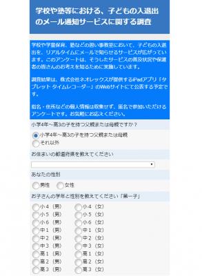 勤怠管理システム「バイバイ タイムカード」やiPad向け勤怠アプリ「タブレット タイムレコーダー」等の企画・開発・販売を行うネオレックス様は、学習塾等で子どもの出入りを保護者に知らせる「入退室メール」に関する市場調査を実施するため、当社のインターネットリサーチサービスを利用されました。