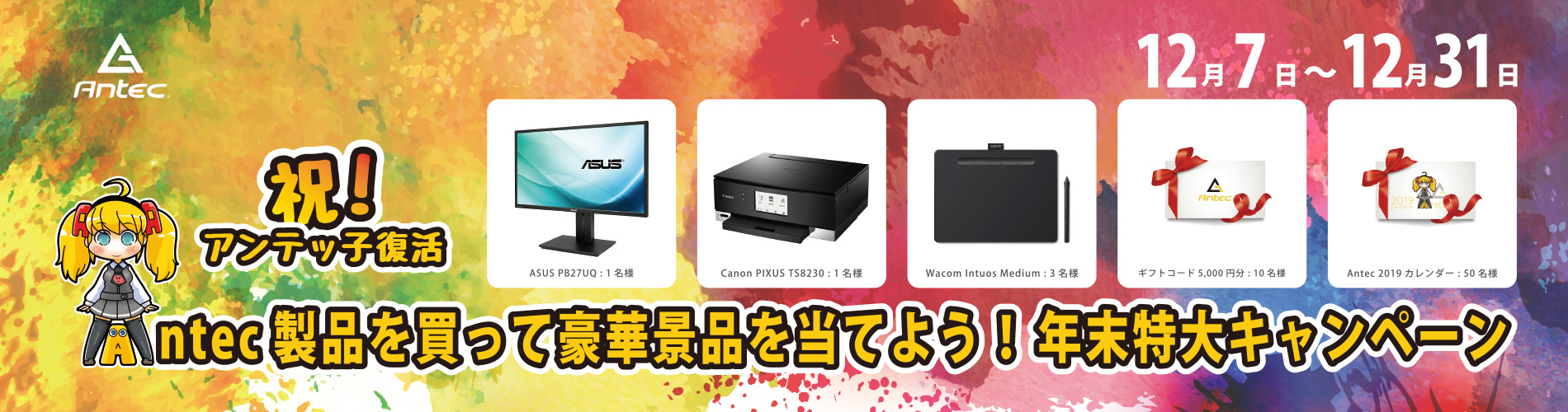 「Antec製品を買って豪華景品を当てよう!年末特大キャンペーン」は、対象のAntec製品の中からいずれかの製品をご購入いただいたお客様に、イラストレーターや、クリエイター向けの人気周辺製品を抽選でプレゼントいたします。キャンペーン開催期間、及び応募受付期間は2018年12月7日(金)~2018年12月31日(月)必着です。