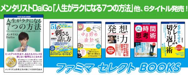 ゴマブックス株式会社(所在地:東京都港区、代表取締役社長:赤井 仁)は、2018年12月4日(火)より、コンビニエンスストア「ファミリーマート」店舗にて販売している『ファミマセレクトBOOKS』のタイトルが入れ替わりました。『人生がラクになる7つの方法』(著:メンタリストDaiGo)など、人気の書籍6タイトルがファミリーマート店舗にてお買い求めいただけます。本企画は、株式会社ファミリーマートとゴマブックスが協力し、人気の電子書籍を店舗で販売するものとなります。