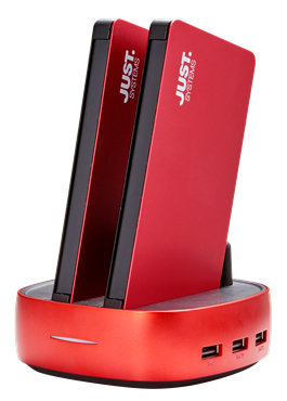 「JUSTロゴ入 2連モバイルバッテリー PowerStation RED」は、今年3月に発売して好評だった「3連モバイルバッテリー」をベースに、バッテリー本体の最大合計出力を5V/2.4Aに向上させた最新のモバイル電源ツールです。タブレットやスマートフォンへの急速充電が可能です。