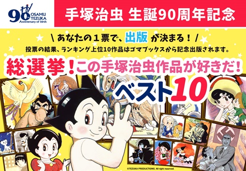 株式会社手塚プロダクションとゴマブックス株式会社(所在地:東京都港区、代表取締役社長:赤井仁)は、漫画家・手塚治虫の生誕90周年を記念し、電子書籍情報サイト電子書籍ランキング.comにて、手塚治虫生誕90周年記念『総選挙!この手塚治虫作品が好きだ!ベスト10』を開催することを発表します。