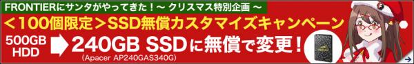 手続きは簡単で、キャンペーン対象のパソコンをご購入いただく際、FRONTIERの通販サイト(フロンティアダイレクトストア)のカスタマイズ画面にて、ご自身で「500GB HDD⇒240GB SSD[0円]」にカスタマイズ選択をしていただくだけです。本キャンペーンは、ご提供予定数に達し、カスタマイズ画面で「無償SSDカスタマイズ」が選べなくなった時点で終了いたします。