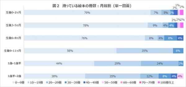生後0ヶ月~2歳の子どもが持っている絵本の冊数は「0~9冊」という回答が一番多い結果になりました(図2参照)。また、月齢別の絵本の所持冊数の平均は下記の通りになっています。子どもの年齢が上がるにつれ、興味・関心に合わせて絵本を購入するためか、絵本の所持数が増えていることが分かります。