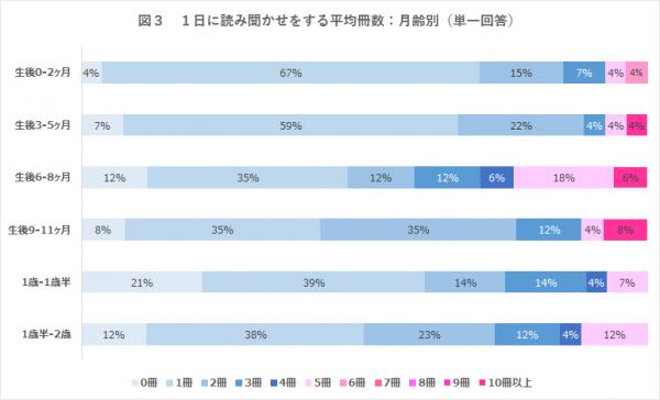 生後0ヶ月~2歳の子どもを持つ親では、1日に読み聞かせをする絵本の冊数は「平均1冊」という回答が46%となり、月齢別に見ても「平均1冊」という回答が多数です(図3参照)。言葉の習得や、集中できる時間が増えるため、年齢が上がるにつれて読み聞かせをする冊数が増加傾向にあります。