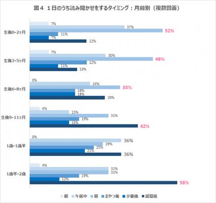 1日の中で読み聞かせをするタイミングで多いのは、「昼」と「就寝前」という結果になりました。月齢別に見ると、生後8ヶ月までの子どもを持つ親は「昼」に読み聞かせをする人が一番多く、生後9ヶ月から2歳の子どもを持つ親は「就寝前」に読み聞かせをする人が一番多いという結果になっています(図4参照)。