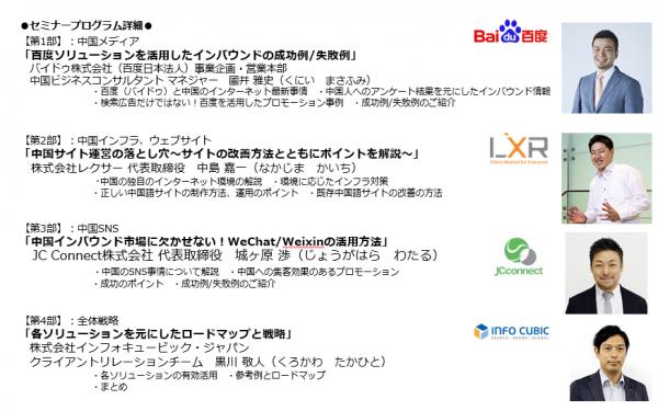 海外デジタルマーケティングの支援を行う株式会社インフォキュービック・ジャパン(本社:東京都新宿区、代表取締役:山岸ロハン、以下:インフォキュービック)は、平成30年12月7日(金)に「中国インバウンドマーケティング4社合同セミナー」をバイドゥ・セミナールーム(東京都港区)にて開催致しました。
