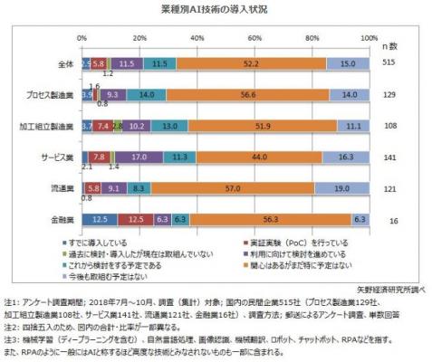 株式会社矢野経済研究所(代表取締役社長:水越孝)は、国内の民間企業に対して法人アンケート調査を実施し、AI(機械学習やディープラーニング、自然言語処理、画像認識、機械翻訳、ロボット、チャットボット、RPAなど)の導入状況や業種別の動向について明らかにいたしました。