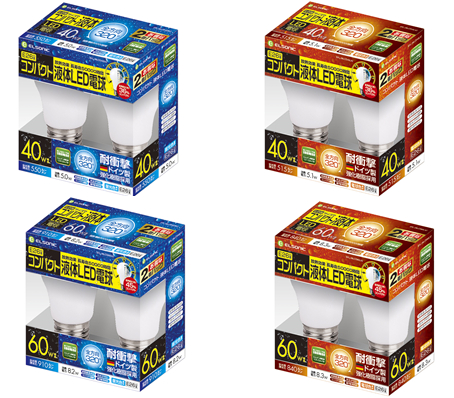 販売価格は、コンパクト液体LED電球2個パックで「EFL-26LCS40DX2」、「EFL-26LCS40LX2」2,780円(税抜)、「EFL-26LCS60DX2」、「EFL-26LCS60LX2」2,980円(税抜)でノジマ全店及びノジマオンラインで販売致します。