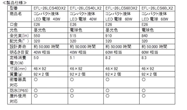 今回発売するコンパクト液体LED電球「EFL-26LCS40DX2」、「EFL-26LCS40LX2」、「EFL-26LCS60DX2」、「EFL-26LCS60LX2」はLED電球本体内に液体が入り、点灯時のおしゃれなデザインに加え、E26口金ほぼ全ての器具に対応したコンパクト設計。浴室、屋外使用にも対応した防水仕様(IP65)の特徴あるLED電球として製品化をしました。