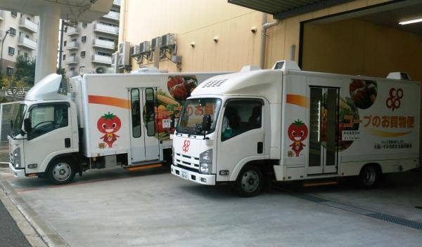大阪いずみ市民生協は、2012年より買物困難地域を巡回する移動販売車「コープのお買物便」を運行しています。