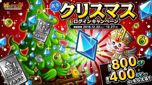 株式会社アソビズム(本社:東京都千代田区、代表取締役:大手智之)は、App Store・Google Playにて好評配信中の『城とドラゴン』で、2018年12月22日(土)より「真冬のクリスマスログインキャンペーン」を開催いたします。また、対象者には最大10,000ルビーが手に入る「年末年始おかえり&新人キャンペーン」や期間中リーグで勝利すると、豪華報酬が手に入る「ひとりでリーグXmasプレゼント争奪バトル」を同時開催いたします。