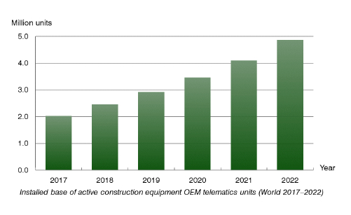 スウェーデンの調査会社ベルグインサイト社(Berg Insight)の調査レポート「世界の建設機械OEMのテレマティックス市場」は、OEMの提供する建設機械のテレマティックスシステム市場について調査している。2019年以降の市場の発展について述べ、成長するテレマティックス市場の最新の動向と発展について記載している。ベルグインサイト社は、世界の稼働している建設機械OEMのテレマティックスシステムの導入数は2017年末の200万から年平均成長率(CAGR)19.2%で成長して2022年には490万になると予測している。ベンダ、製品、市場の最新の情報を提供している。