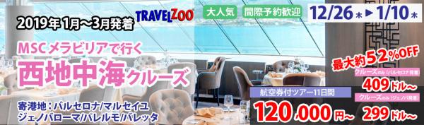 株式会社ベストワンドットコム(本社:東京都新宿区、代表取締役社長:澤田秀太)は、12月26日のトラベルズーにて、「新造船MSCメラビリア号で行く 西地中海4か国(スペイン・フランス・イタリア・マルタ島)周遊クルーズ 11日間」のツアーを発表し、予約受付を開始いたしました。