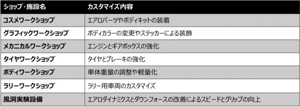 ■ラリーワークショップ:ダートや雪上などの未塗装路で開催されるラリーに参加するためには、車高やタイヤ、トランスミッションなどをラリー専用にカスタマイズすることが必須となります。通常のドライブではあまり行わない特殊な組み合わせを楽しみながら、ワイルドなラリーに参戦しましょう!