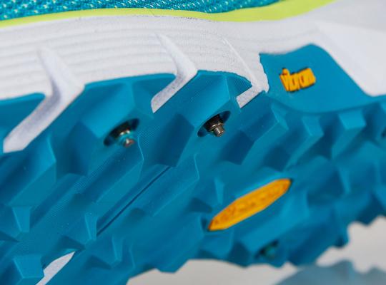 アウトソールにはビブラム社の「ライトベース」を採用。「ライトベース」は強力な滑り止め機能で知られる「メガグリップ」の効果を維持しながら、厚みを大幅に削減し、約30%の軽量化に成功した新技術で、そこにタングステン製の頑丈な13本のスタッドを装着することで、雪や氷、泥の中でしっかりと足場を確保するよう設計されています。