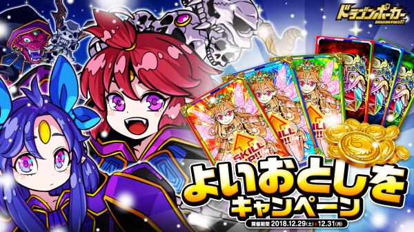 株式会社アソビズム(本社:東京都千代田区、代表取締役:大手智之)は、App Store・Google Playにて好評配信中のリアルタイム合体カードバトル『ドラゴンポーカー』で、2018年12月29日(土)より「よいおとしをキャンペーン」を開催いたします。ログインごとに「SSレア進化指輪」や「女神スキルフェアリー」などのアイテムをプレゼント!『ドラゴンポーカー』に毎日ログインして、豪華報酬を受け取りましょう!
