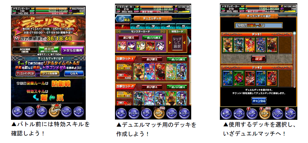 デュエルマッチ開催期間中の勝利数や、終了時のリーグランキング順位に応じて、ドラゴンメダルやSレアガチャチケット、女神スキルフェアリー等の報酬を獲得できます。また、累計勝利数の条件を達成すると、限定カードを獲得できます。デュエルマッチに挑戦し、限定報酬を手に入れましょう!
