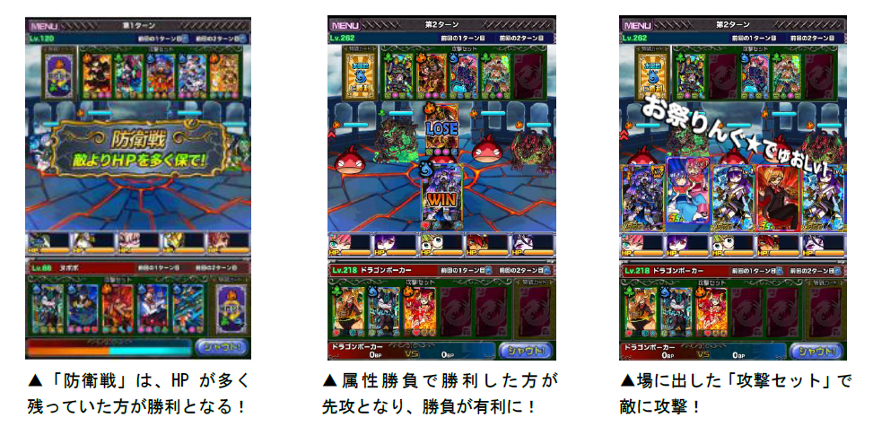 バトルは、基本的に3ターンで決着をつけます。「殲滅戦」と「防衛戦」に関しては、3ターンで決着がつかなかった場合(全て引き分け、またはBPが同じだった場合)、勝利条件を満たすまでバトルを行なうサドンデスモードに入ります。