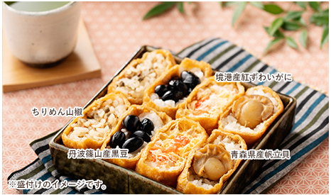 内容 : 黒豆いなり・ちりめん山椒いなり・紅ずわいがにいなり・帆立貝いなり