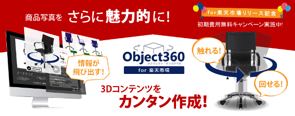 コンテンツ管理ソリューションやビジネスVR(バーチャル・リアリティ)ソリューションを提供する、株式会社エージェンテック(本社:東京都千代田区、代表取締役社長:金 淙採)は1月16日、楽天株式会社(本社:東京都世田谷区、代表取締役会長兼社長:三木谷 浩史)が運営するインターネットショッピングモール「楽天市場」に出店しているEC事業者向けに、3Dコンテンツ制作ツール「Object360 for 楽天市場」の提供を開始しました。 “楽天市場公式”「RMS Service Square」上でお申し込みいただけます。