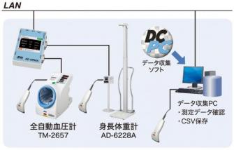 入力作業を省力化し、業務効率を向上させることができます。入力・転記ミスが防止できますので、測定データの信頼性が向上いたします。A&D血圧計、体重計、身長体重計の他、健診で使われる測定機器との接続が可能です。