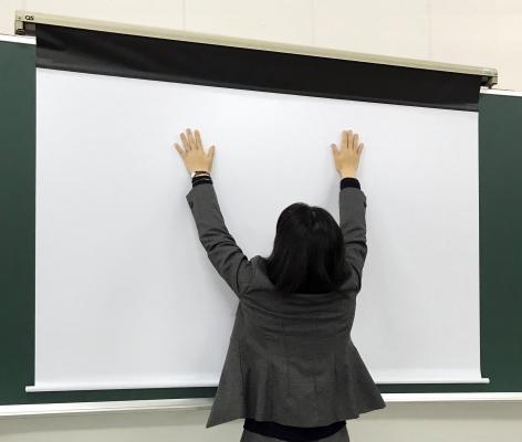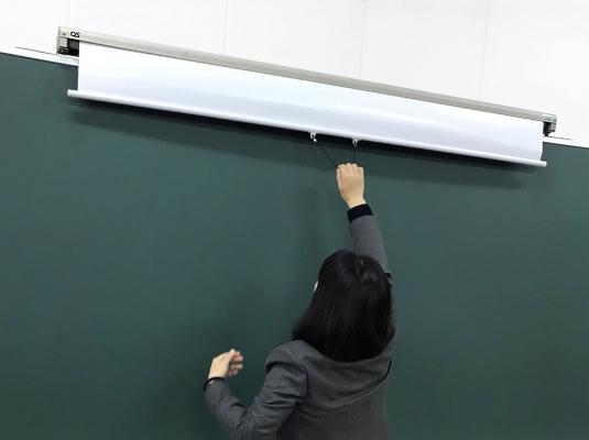 黒板フレームの上部に本体を固定する方式で、未使用時には黒板の板書の妨げになりません。使用時にはケースからスクリーンを引き下げるだけで黒板面に簡単に吸着し設置の手間も必要がなく、授業に集中することができます。
