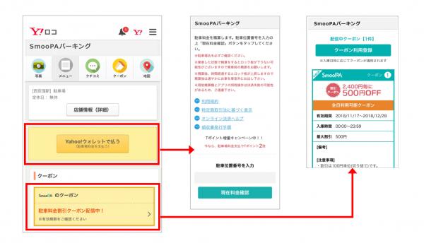 ユーザーは「Yahoo!ロコ」から該当駐車場ページにアクセスし、駐車料金が決済可能な駐車場の場合は【Yahoo!ウォレットで払う】、割引クーポンが利用できる駐車場の場合は【駐車料金割引クーポン配信中!】をそれぞれタップすることでサービスのご利用が可能です。