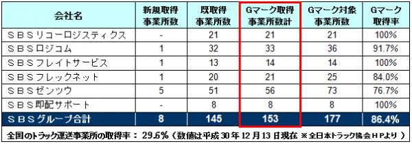 SBSグループは、(社)全日本トラック協会が昨年12月に実施した貨物自動車運送事業安全性評価事業(以下、Gマーク制度)2018年度安全性優良事業所※の評価にて、新たに8事業所が認定を受けました。これによりGマーク認定事業所数は153、取得率は、86.4%になりましたことをお知らせします。