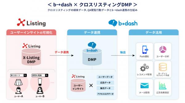 株式会社クロスリスティング(本社:東京都渋谷区/代表取締役:細田成文、以下クロスリスティング)が提供する「クロスリスティングDMP」と株式会社フロムスクラッチ(本社:東京都新宿区/代表取締役:安部泰洋、以下フロムスクラッチ)が開発・提供する、マーケティングプラットフォーム「b→dash(ビーダッシュ)」との連携が、本日より開始されたことをお知らせいたします。