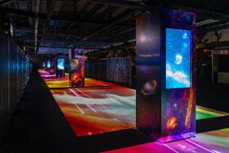 今回のリニューアルでは、足元に3Dプロジェクションマッピングによって投影された宇宙空間が新たに登場。360 度に広がる“究極の宇宙空間”が来場者を包み込み、一歩足を踏み入れると宇宙空間の中をワープしているかのような不思議な感覚を味わうことができます。本イベントのエントランスを華やかに彩る、日本最大級の”光の超体感型トンネルです。