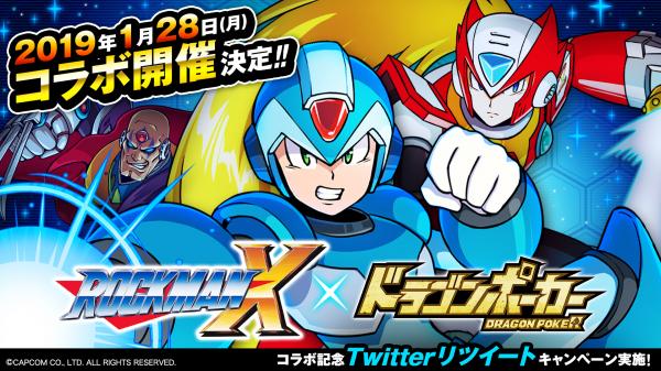 株式会社アソビズム(本社:東京都千代田区、代表取締役:大手智之)は、App Store・Google Playにて好評配信中のリアルタイム合体カードバトル『ドラゴンポーカー』で、2019年1月28日(月)より株式会社カプコン(本社:大阪市中央区、代表取締役社長:辻本春弘)のアクションゲーム『ロックマンX』とのコラボイベント開催を決定いたしました。コラボ期間中、「エックス」や「ゼロ」など『ロックマンX』のキャラクターたちが期間限定で登場!さらに、これを記念して、豪華報酬が手に入るリツイートキャンペーンも本日より開催!近未来を舞台に開催される夢のイベントをお楽しみにお待ちください!