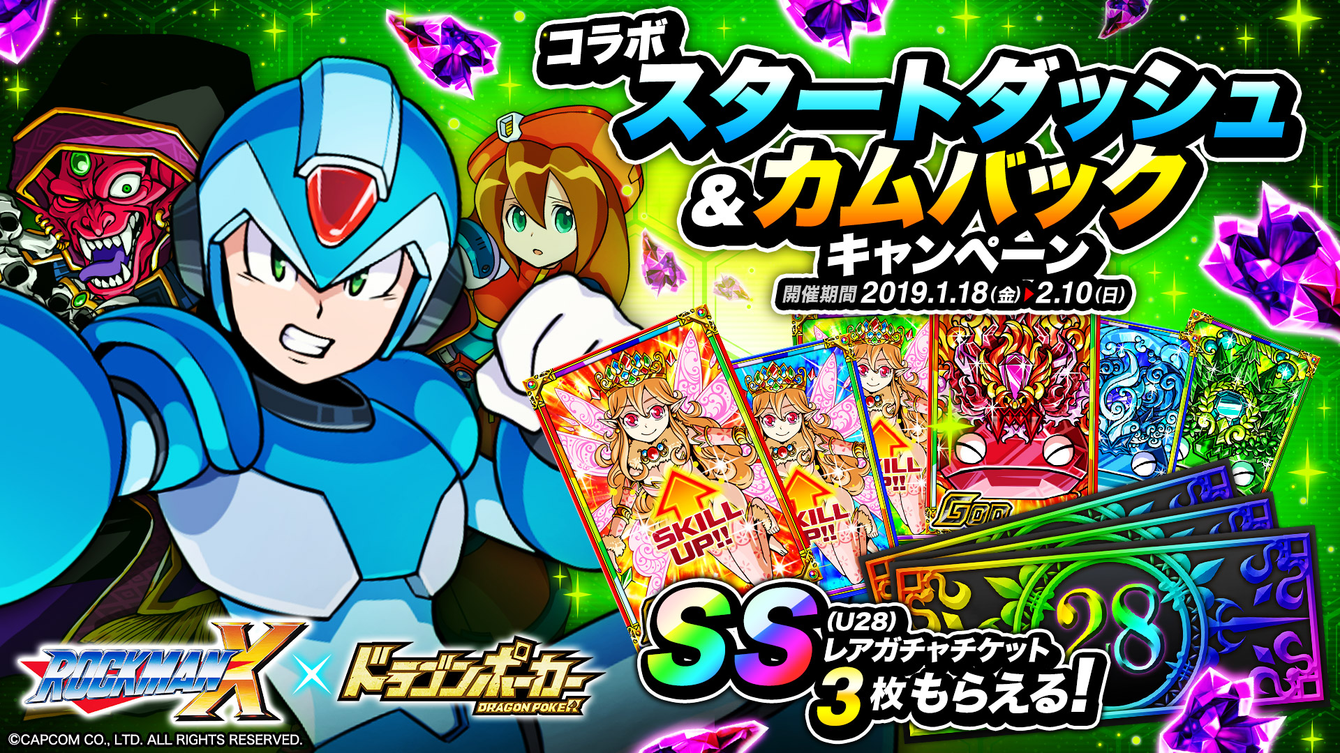 『ロックマンX』コラボ記念「コラボスタートダッシュ&カムバックキャンペーン」開催!ログインした方全員に、竜石最大63個プレゼント!友達を誘って、ドラゴンポーカーを楽しみましょう!