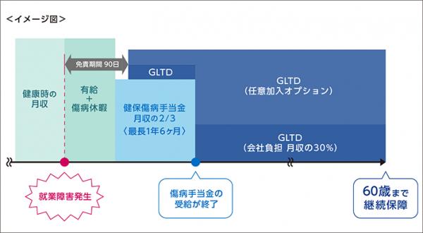 GLTD とは、従業員のケガや病気による長期休職による喪失所得を長期的に補償する制度です。