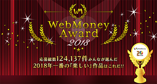 株式会社ウェブマネー(本社:東京都港区、代表取締役社長:森田 康裕)は、「WebMoney」20周年特別企画として、今年一番、人生で一番の『楽しい』作品を決める祭典『WebMoney Award 2018』(開催期間:2018年11月27日~12月17日)での投票結果に基づく各受賞タイトルが決まりました。