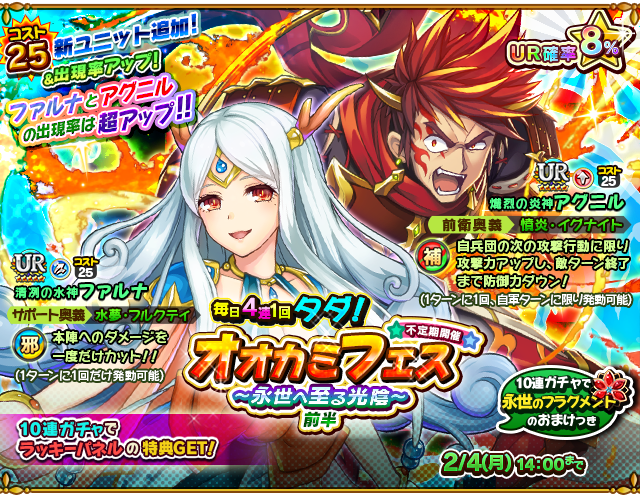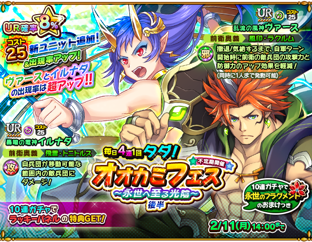 レアガチャでは、初のコスト25の強力なURユニット「熾烈の炎神アグニル」、「清冽の水神ファルナ」、「乱流の風神ヴァース」、「轟鳴の電神イルナダ」の4体が追加されます。