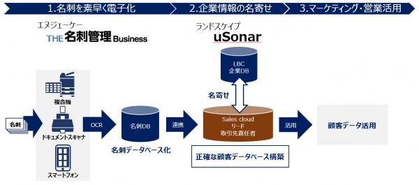 株式会社エヌジェーケー(本社:東京都中央区、代表取締役社長:石川 勝雅 以下「エヌジェーケー」)と株式会社ランドスケイプ(本社:東京都新宿区、代表取締役社長:福富 七海 以下「ランドスケイプ」)は、エヌジェーケーの名刺管理クラウドサービス「THE 名刺管理 Business」と、ランドスケイプの顧客データ統合ツール「uSonar」を、Salesforce顧客データベースを介して連携させ、電子化した名刺情報を素早くデータクレンジング・名寄せし、正確な企業情報として活用いただけるソリューションを2019年2月より提供開始します。