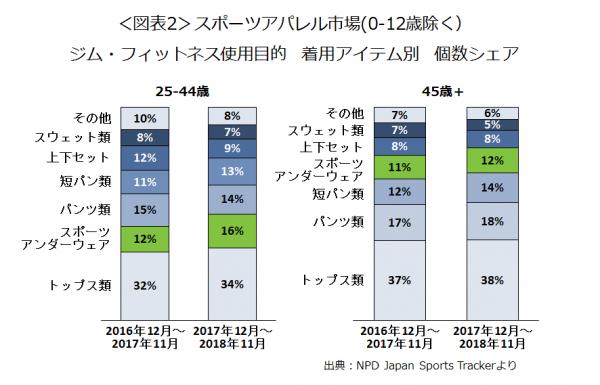 スポーツアパレル ジム・フィットネス使用目的において大きな比率を占める45歳以上と、シェアを伸ばした25-44歳を比較してみます(図表2)。