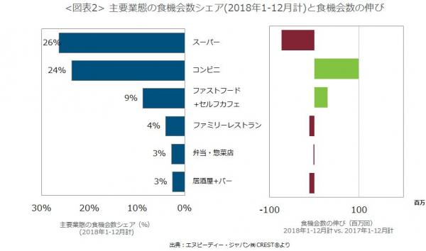 業態別の食機会数の成長率(図表2)をみてみると、全体の26%を占めるシェア1位のスーパーマーケットが客数(食機会数)を大きく減らしました。一方で、コンビニがスーパーの減少分以上客数(食機会数)を伸ばしました。ファストフード+セルフカフェの客数(食機会数)も成長しました。ファミリーレストラン、居酒屋+バーはマイナス成長となりました。
