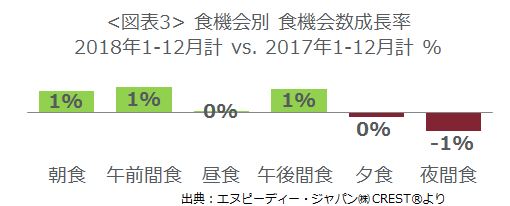 食機会別の食機会数成長率(図表3)をみると、朝食、午前間食、午後間食がプラス成長でした。働き方改革や働く女性の増加などで、朝食の外食・中食需要は高まっています。一方で、夕食や夜間食は、残業の減少や度重なる自然災害の影響でマイナス成長となりました。昼食は横ばいです。