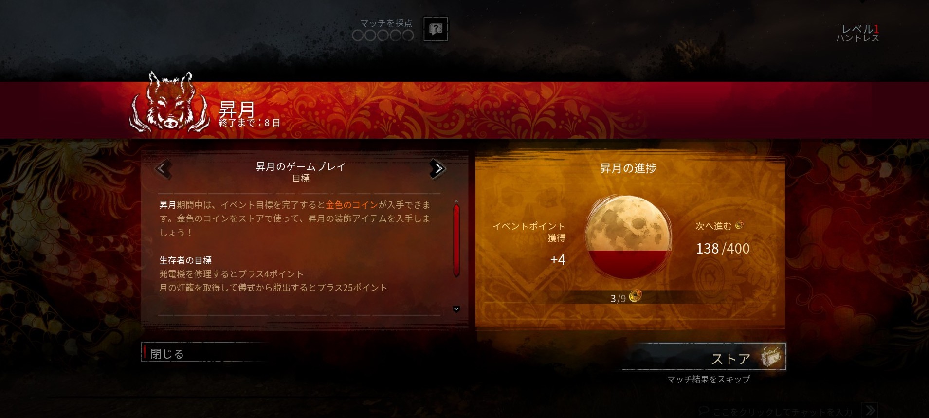 マップ上にある灯籠を見つけて集めましょう。灯籠を集めて脱出に成功するとポイントが加算され、ポイントに応じて金色のコインを獲得できます。発電機を修理することでもポイントが加算されます。