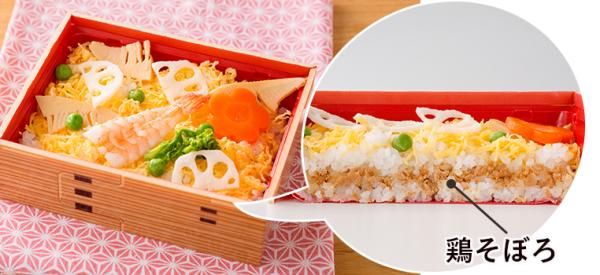 京都洛西産の筍、菜の花、海老、蓮根、花にんじんなど春の食材を使用して、錦糸玉子を華やかにまぶし、彩り豊かなちらし寿司に仕上げています。更に、酢飯の間に甘辛く味付した鶏そぼろを敷き、京都北部の郷土料理のちらし寿司を再現しました。