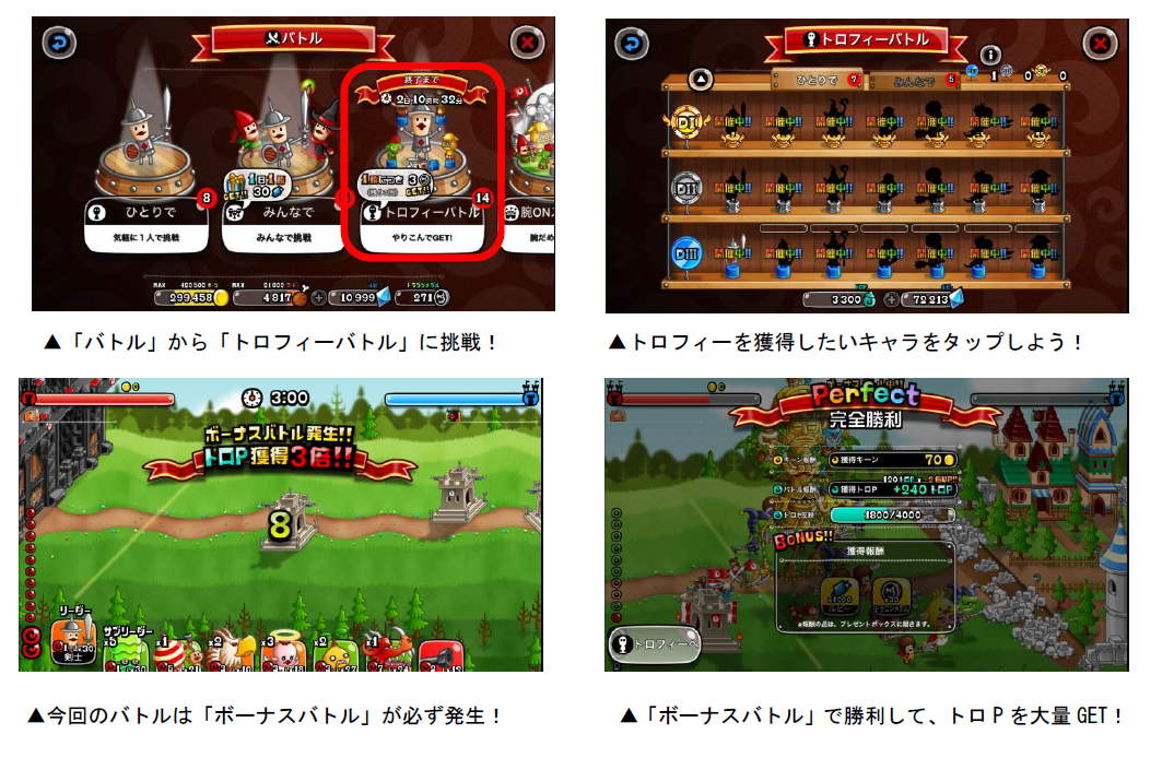 各キャラのトロフィーは、「トロP」を一定数貯めると獲得することができます。トロPは「キャラのLvが20以上」「うまP200以上」など、各キャラによって異なる条件を満たした状態でバトルを行なうと獲得できます。また、今回は「スーパーボーナスフィーバー」が同時開催され、全てのトロフィーバトルで「ボーナスバトル」が発生します。ボーナスバトルではバトルの勝敗に関係なく、獲得トロPが必ず3・5・10倍のうちいずれかの倍率で増加します。ボーナスバトルで勝利して、トロPの大量獲得を目指しましょう!