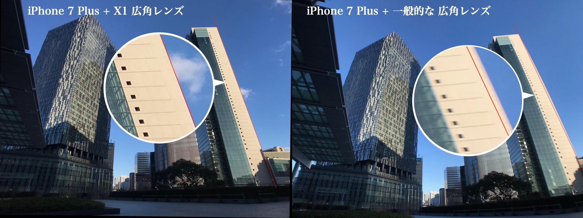 広角レンズでは、縁辺部が外側に膨らんだり(樽型収差)、内側にへこんだり(糸巻き型収差)する歪曲収差(ディストーション)がつきものです。「USHADOW X1レンズシステム」の広角レンズでは、このゆがみをゼロに近づけることを目指した設計となっており、プロフェッショナルクラスの仕上がりとなっております。