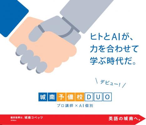 『城南予備校DUO』は、“プロ講師”による「DUO授業」と“AI(人工知能)”による「AI授業」の掛け合わせを基軸とした、新しい塾のカタチです。