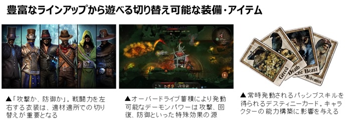 本作にはキャラクターではなく装備に対して固有のスキルが存在します。対峙する敵に対して最も効果的な戦闘力を、豊富な装備のバリエーションから瞬時に選択することが可能です。ジャンプや回避といった激しいアクション要素と素早い装備の切り替えが楽しめるダイナミック(動的)なゲームシステムを、全編を通してお楽しみいただけます。
